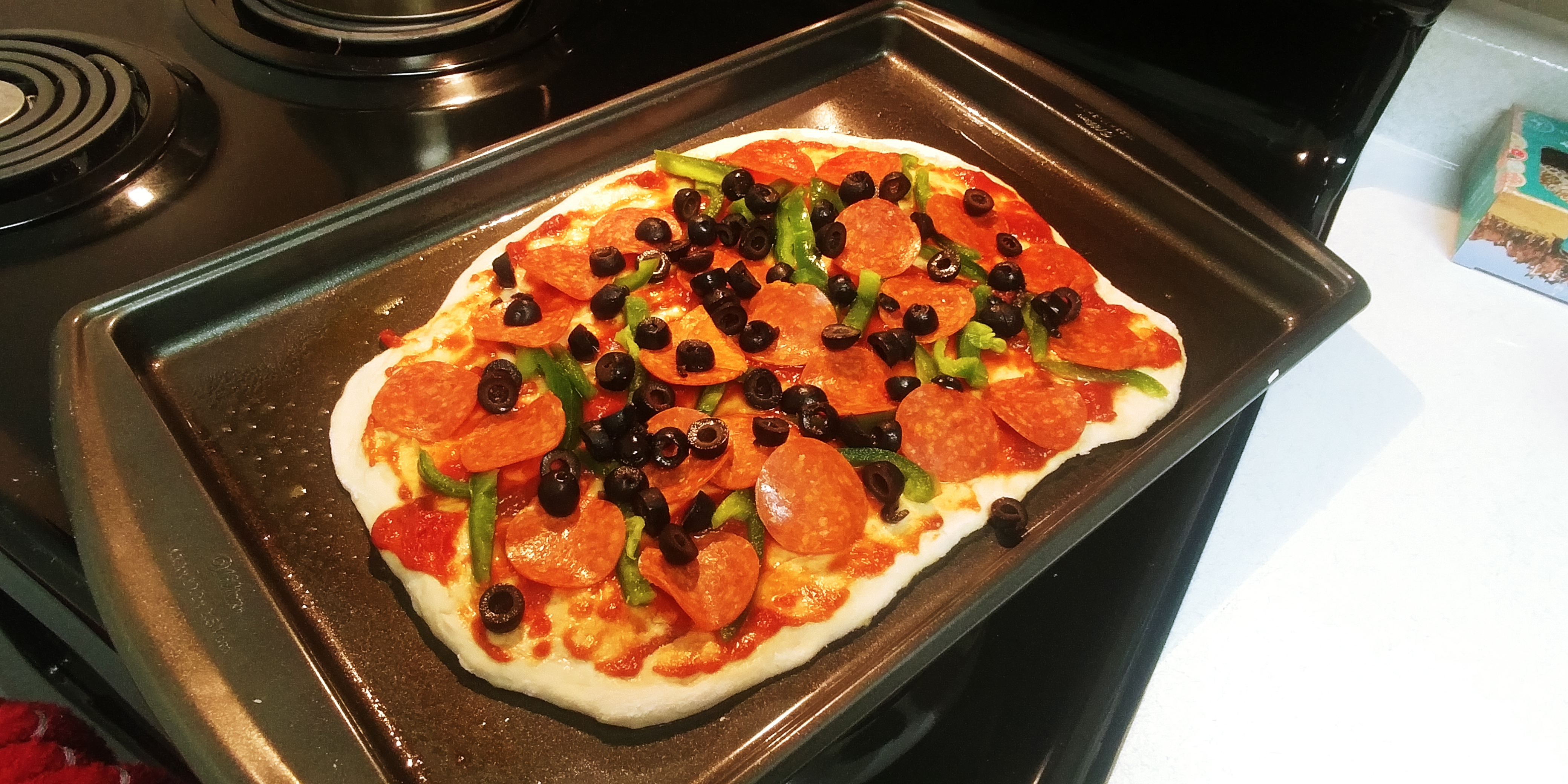 Topping are whatever I had in my fridge at the time: Pepperoni, Black Olives, Pickled Banana Peppers and Green Bell Peppers, (No Cheese TYVM).